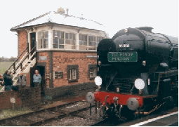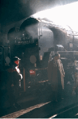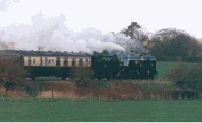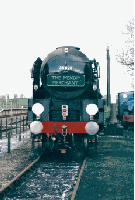 What a great day.Clan line looked superb a pity the weather was, well different to say the least. Clan line arrived in sunshine.Then when shunting the stock to free the loco from the coaches the skies darkened and the the hail storm. This lasted for about 10 minuets and everywhere you looked the ground was white!! Then the skies changed back to sunshine.After being coaled and watered Clan Line returned to the station then finally departed in the best light of the day.